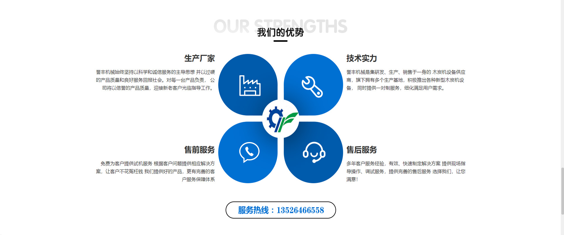 譽豐機械是集研發、生產、銷售于一身的 木炭機設備供應商,旗下擁有多個生產基地,積極推出各種新型木炭機設備, 同時提供一對制服務,細化滿足用戶需求。售后服務